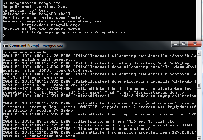Let’s first connect to MongoDb manually. Open a command prompt, navigate to c:\mongodb\bin and issue the following command: