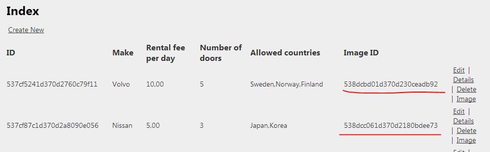 Run the application to test if it’s still working. The image IDs will be empty of course in the Cars table. Click the Image link to see if it leads us to the empty Image view.