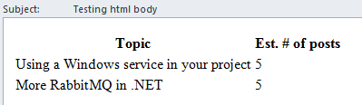 string from = "andras.nemes@company.com"; string to = "john.smith@company.com"; string subject = "Testing html body"; string htmlBody = @" <html lang=""en""> <head> <meta content=""text/html; charset=utf-8"" http-equiv=""Content-Type""> <title> Upcoming topics </title> </head> <body> <table> <thead> <tr> <th>Topic</th> <th>Est. # of posts</th> </tr> </thead> <tbody> <tr> <td>Using a Windows service in your project</td> <td>5</td> </tr> <tr> <td>More RabbitMQ in .NET</td> <td>5</td> </tr> </tbody> </table> </body> </html> "; MailMessage mailMessage = new MailMessage(from, to, subject, htmlBody); mailMessage.IsBodyHtml = true; string smtpServer = "mail.company.com"; SmtpClient client = new SmtpClient(smtpServer); client.Send(mailMessage);