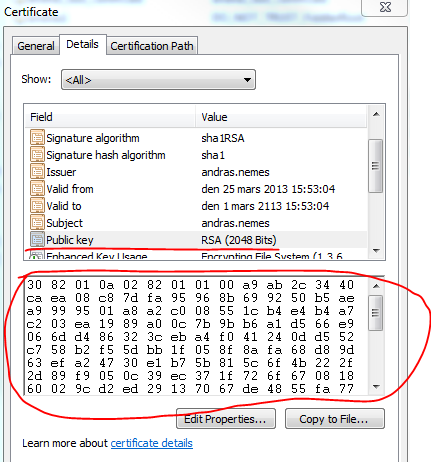 What is this public key? If you open the Details tab in the Certificate window you’ll find a property called Public key with some long byte content: