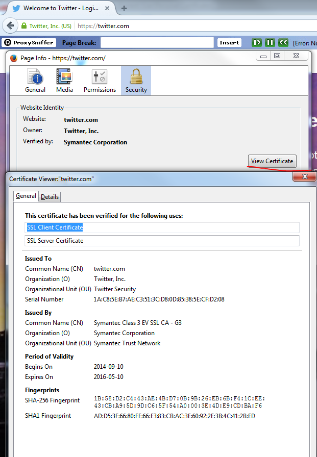 Modern browsers are equipped with tools to handle certificates. If you navigate to twitter.com you’ll see that the server certificate has been verified: