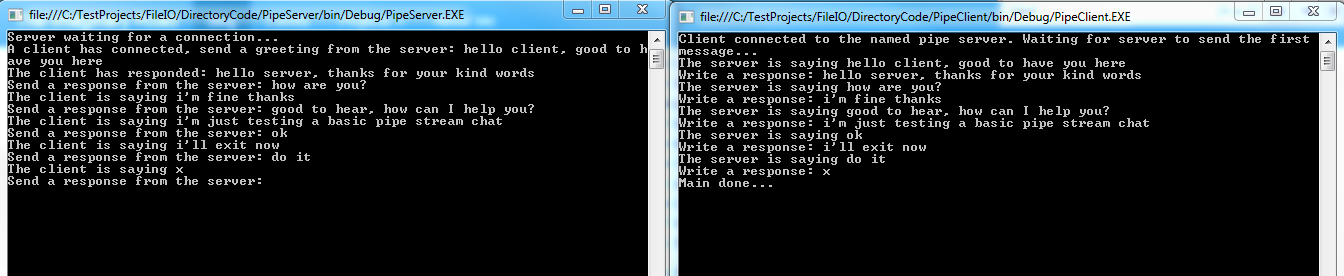 In this post we saw how a pipe stream client and server can send each other single bytes. In this post we managed to send a single message from the client to the server. It’s time to marry the two concepts. We’ll let the client and server start a conversation.