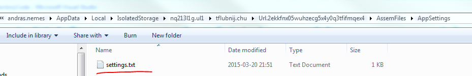 When the code execution stops hover over “applicationStorageFileForUser” and open the “Non-public members” section. You’ll see a property called RootDirectory in the bottom of the list. The value should point to a user-specific location. In my case it is…