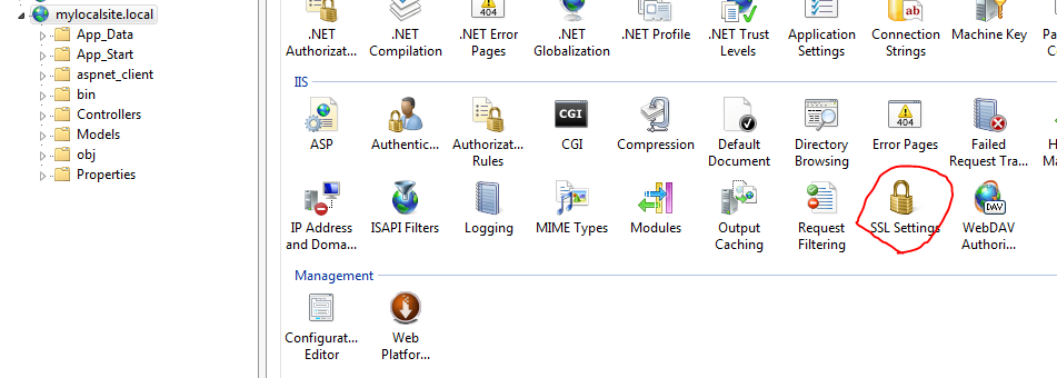 Next we’ll enable client certificates for our web site. Click the web site node in IIS and double-click on the SSL Settings option: