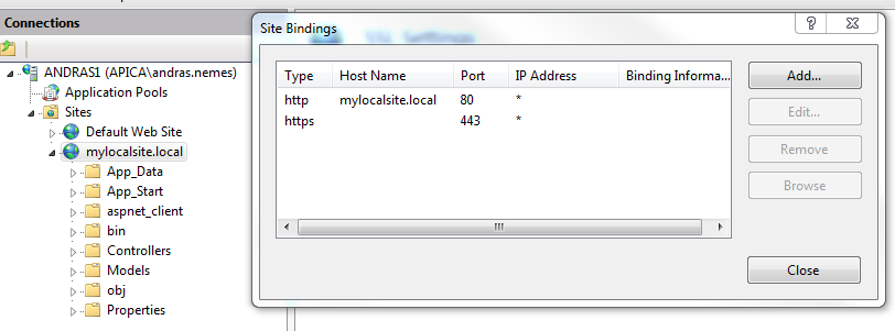 Click OK. You’ll see the new site under the Sites folder in IIS. Next right-click the mylocalsite web site node and click Edit Bindings. There will be one binding, the https one we’ve just added. Click Add… and we’ll also define a HTTP binding with a host name: