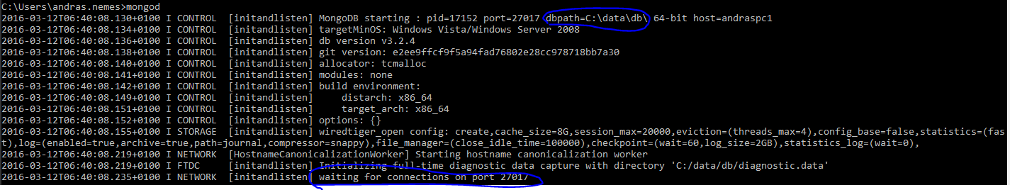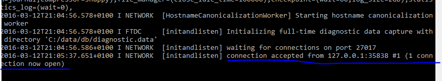 It is now waiting for connections on port 27017. You may get a warning from Windows that mongod has been blocked by the firewall but you can safely select the Allow option.