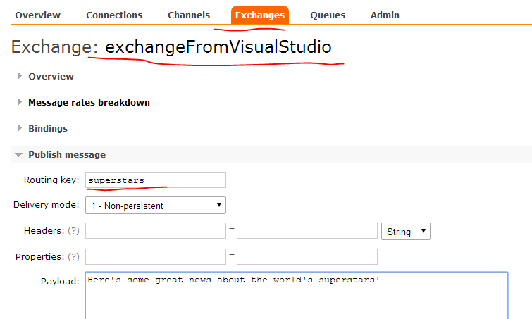 Let’s test if this setup works. In the UI navigate to the exchange created through VS and publish a message: