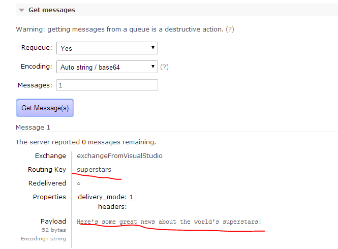 The routing key means that if the message routing key contains the word “superstars” then it will be routed from exchangeFromVisualStudio to queueFromVisualStudio.