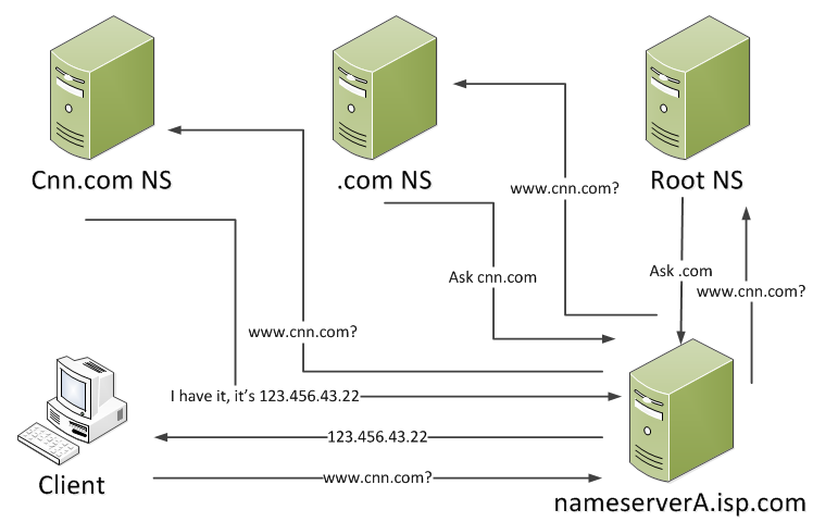 The image is a bit messy so make sure you follow all the arrows based on the description. As you see the configured name server nameserverA.isp.com has a central role in the quest for finding the IP address. It takes a couple of stops before the final answer has been found.