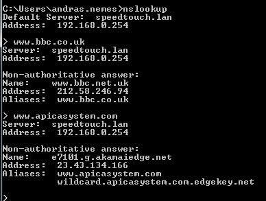 When you’re done using nslookup in the multiple query mode you can just type exit to come back to the ‘normal’ command prompt mode. In case you want to change the DNS server for your lookup query then enter the multiple query mode again by typing ‘nslookup’ and run the command ‘server [ip of the dns server you want to ask]’, e.g. server 123.456.678.43 and then ask for http://www.microsoft.com to see if you get the same IP address as in the case of the default DNS server.