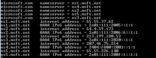 Here you see the name servers that are responsible for the microsoft.com namespace. Here we see 5 name servers. In the name resolution process your computer will pick one of those at random.