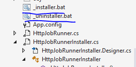 HttpJobRunner has all the dependencies it needs now so we can continue. Well, almost. recall that we saved the connection string and the HttpJobs table name in app.config of the Console application. Check the files available for the Windows service project. There should be another app.config. When we deploy the Windows service then it will consult its own app.config, which is totally independent of the app.config of ConsoleConsumer. It won’t magically have access to the configuration file of the Console app. This means that we need to add the same settings to HttpJobRunner.app.config too. Copy the settings so that the Windows service app.config looks as follows: