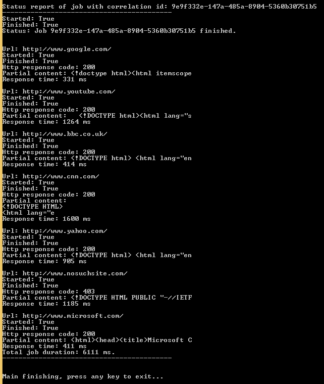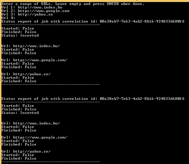 This should be all we need to have a simple but functioning system. Rebuild the solution, uninstall the service and install it again as we did before. Check the log file to make sure the service has “checked in”. Then run the Console app, enter a couple of URLs and wait for the status messages. In my case I got the following: