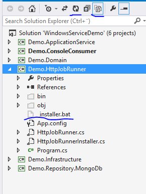 You’ll need to add a reference to all other projects in the solution from Demo.HttpJobRunner for this code to compile. We do nothing else but declare the concrete implementations of the abstractions in the entry point of the Windows service application.