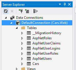 UserManagementDbContext will use a connection string defined in web.config as “DefaultConnection”. We want to make sure that the Cars DB context uses the same connection. Insert the following constructor to CarsDbContext: