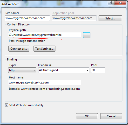- Create a new website: give it some name – I called mine wfftest.apica.local. Leave the host name blank to keep it simple