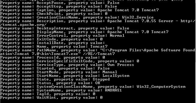 In this case starting Tomcat7 won’t trigger the watcher. Neither will stopping any other Windows service. The event watcher will only react if a service names “Tomcat7” was stopped, i.e. the “Status” property of the target instance was set to “Stopped”.